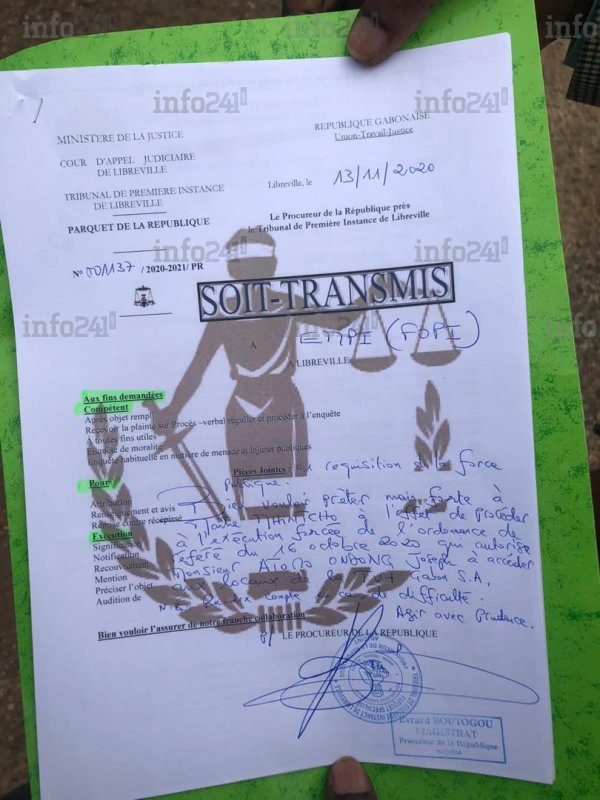 Mais aussi curieux que cela puisse paraître dans un État dit de droit comme le Gabon, la préfecture de police n’a daigné vouloir exécuter ni, le premier soit-transmis qui était adressé au préfet de police, ni au second adressé à la FOPI. Dans l’un comme dans l’autre, il est pourtant fait mention de ce que le procureur, en sa qualité de chef hiérarchique des policiers, ordonnait à ces derniers de « bien vouloir prêter main forte à l’exécution forcée de l’ordonnance de référé du 16 octobre 2020 qui autorise Monsieur Atomo Ondong Joseph à accéder aux locaux de TV+ Gabon SA... ».