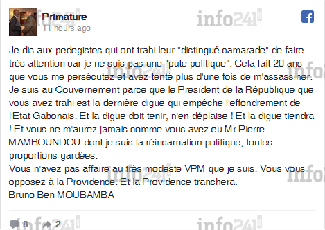 L’opposant "réformateur" s’est voulu tout de même précis dans cet énième coup de gueule : « Je dis aux pedegistes qui ont trahi leur "distingué camarade" de faire très attention car je ne suis pas une "pute politique" ». Le vice premier ministre gabonais d’expliquer sa présence au gouvernement en ces termes : « Je suis au Gouvernement parce que le Président de la République que vous avez trahi est la dernière digue qui empêche l’effondrement de l’Etat Gabonais ».