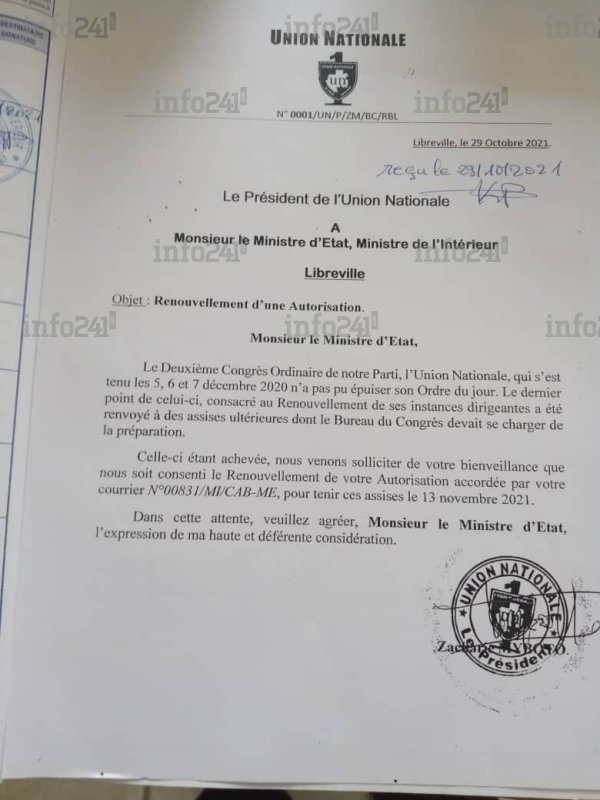 Après moultes péripéties et renvois, la nouvelle date fixant la tenue du Congrès électif de l’Union Nationale (UN) est arrêtée au 13 novembre prochain. C’est du moins ce que révèle une demande d’autorisation que le président sortant de cette formation politique, Zacharie Myboto, a adressé ce vendredi au ministre de l’Intérieur Lambert Noël Matha.