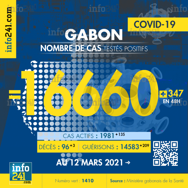 Bilan épidémiologique du Gabon au 12 mars 2021 : 347 nouveaux cas enregistrés en 48h dans l’Estuaire (232 cas), le Moyen-Ogooué (49 cas), le Haut-Ogooué (46 cas), l’Ogooué-Maritime (10 cas), la Nyanga (4 cas), l’Ogooué-Lolo (4 cas) et le Woleu-Ntem (2 cas). Il y a eu 3 nouveaux décès et 209 nouvelles guérisons.