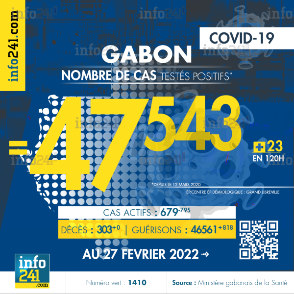 Bilan épidémiologique du Gabon au 27 février 2022 : 23 nouveaux cas enregistrés en 120h dans le Woleu-Ntem (10 cas), l’Estuaire (8 cas), l’Ogooué-Maritime (4 cas) et le Moyen-Ogooué (1 cas). Il y a eu aucun nouveau décès et 818 nouvelles guérisons.
