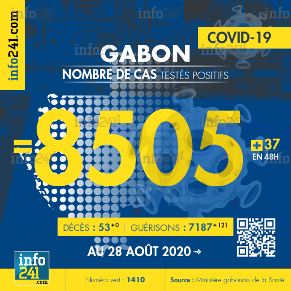 Ce qui porte le bilan à 8 505 cas confirmés, 53 décès et 7 187 guérisons. Le Gabon compte actuellement 1 265 cas actifs de la pandémie officiellement déclarés. Parmi eux 30(+0) patients hospitalisés dans le pays dont 2(+0) en réanimation.