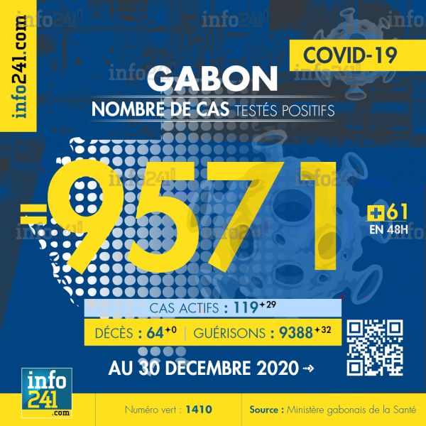 Bilan épidémiologique du Gabon au 30 décembre 2020 : 61 nouveaux cas enregistrés en 48h uniquement dans l’Estuaire. Il y a eu aucun nouveau décès et 32 nouvelles guérisons.