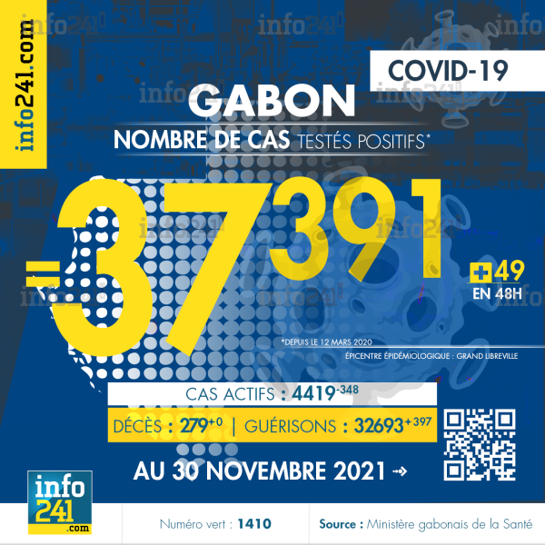 Bilan épidémiologique du Gabon au 30 novembre 2021 : 49 nouveaux cas enregistrés en 48h dans l’Estuaire (26 cas), l’Ogooué-Maritime (9 cas), le Haut-Ogooué (6 cas), le Moyen-Ogooué (4 cas), l’Ogooué-Ivindo (3 cas) et la Nyanga (1 cas). Il y a eu aucun nouveau décès et 397 nouvelles guérisons.