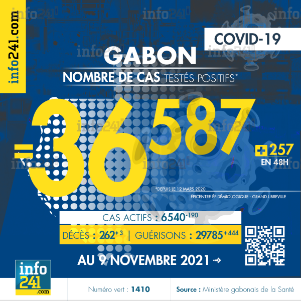 Bilan épidémiologique du Gabon au 9 novembre 2021 : 257 nouveaux cas enregistrés en 48h dans l’Estuaire (120 cas), l’Ogooué-Maritime (102 cas), le Haut-Ogooué (19 cas), le Woleu-Ntem (8cas), la Nyanga (3 cas), la Ngounié (2 cas), l’Ogooué-ivindo (2 cas), et l’Ogooué-Lolo (1 cas). Il y a eu 3 nouveaux décès et 444 nouvelles guérisons.