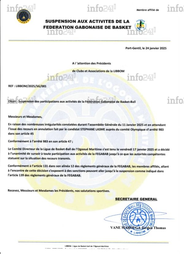 « Le Comité directeur de la Ligue de basket-ball de l’Ogooué-Maritime a décidé à l’unanimité de surseoir à toute participation aux activités de la Fégabab jusqu’à ce que les autorités compétentes statuent sur la situation des recours transmis », précise la Ligue de basket-ball de l’Ogooué-Maritime (LIBBOM) dans son communiqué parvenu ce vendredi à la rédaction d’Info241.