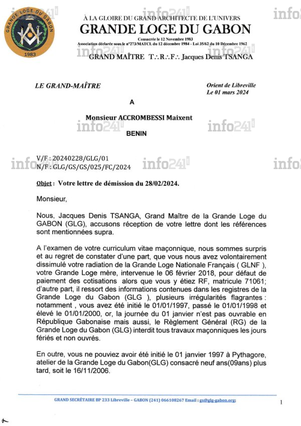 Le « Grand Maître » des francs-maçons du Gabon doute ainsi de son initiation « le 1er janvier 1997 à Pythagore, atelier de la Grande Loge du Gabon (GLG), consacré neuf ans (09 ans) plus tard, soit le 16 novembre 2006 ». Un passé trouble qui lui vaut « en lieu et place de votre démission nous transmise, par la présente, nous vous notifions plutôt, la cessation des privilèges, des droits de direction et de représentation dolosivement obtenus par vous de la GLG », conclut le courrier officiel parvenu à la rédaction d’Info241.