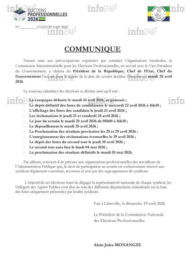 Élections professionnelles au Gabon : le scrutin repoussé au 28 avril à la demande des syndicats © 2026 D.R./Info241