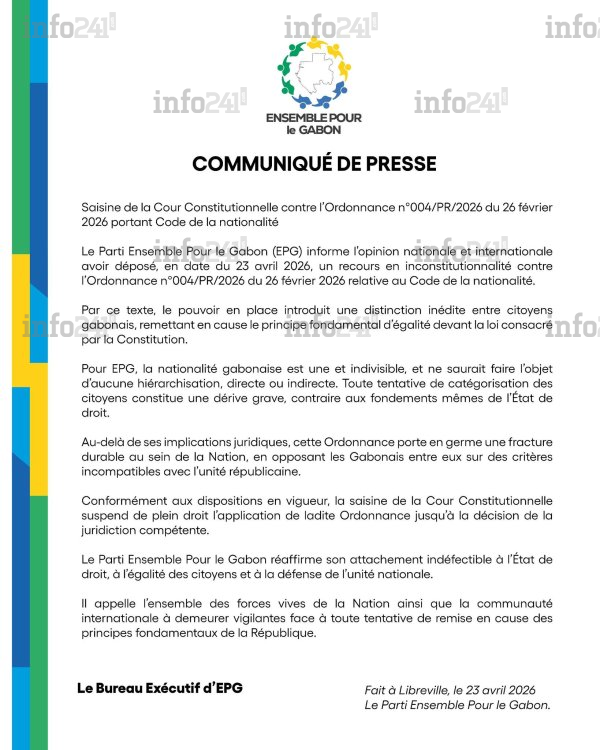 Cette fois, EPG déplace la bataille vers la Cour constitutionnelle. Dans son communiqué, le parti indique avoir « déposé, en date du 23 avril 2026, un recours en inconstitutionnalité contre l’ordonnance n°004/PR/2026 du 26 février 2026 relative au Code de la nationalité ». À travers cette démarche, la formation politique entend faire annuler un texte qu’elle accuse d’introduire une rupture grave dans l’égalité entre citoyens gabonais.