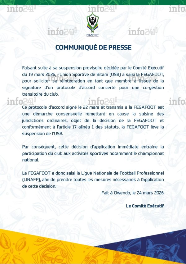 La fumée blanche est enfin sortie du siège de la Fédération gabonaise de football (Fégafoot) à Owendo. Dans un communiqué de presse rendu public ce mardi 24 mars 2026, l’instance faîtière du sport roi a officiellement annoncé la levée de la suspension provisoire qui frappait l’Union sportive de Bitam (USB). Une décision salvatrice pour le club nordiste, qui va pouvoir retrouver les pelouses du championnat national de première division, alors que la compétition a déjà amorcé sa 3e journée ce même mardi.