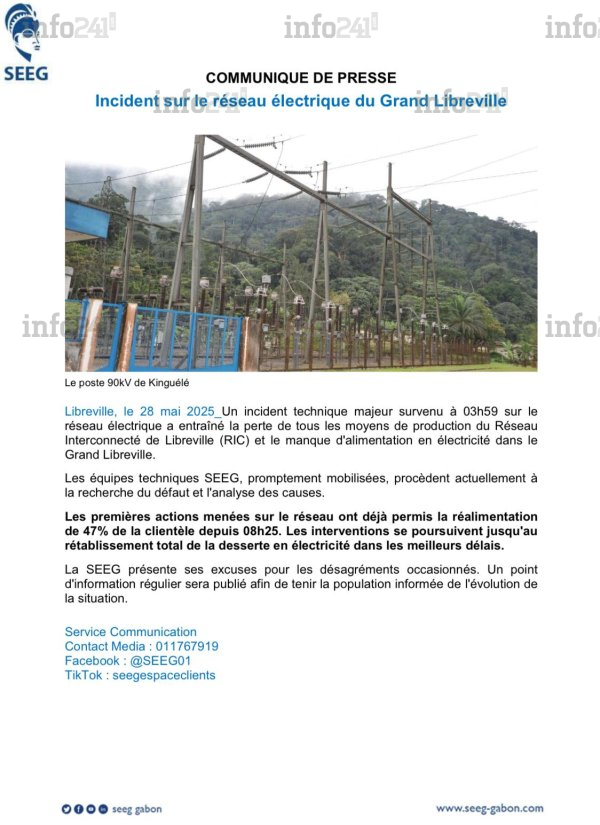 À 03h59, un « incident technique majeur » — selon le communiqué officiel — a provoqué la perte de tous les moyens de production du Réseau interconnecté de Libreville (RIC). Résultat  : coupure généralisée dans la capitale et ses environs. Si 47 % de la clientèle a été réalimentée dès 08h25, le message est clair : la SEEG patine encore dans la boue des promesses non tenues.