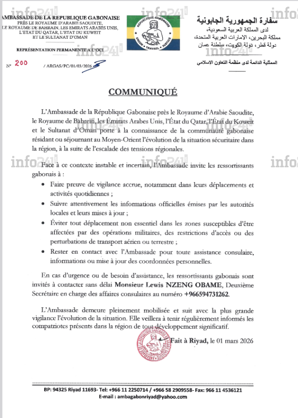 Soucieuse de maintenir un lien étroit avec sa diaspora dans ces moments critiques, l’ambassade demande à ses ressortissants de rester en contact permanent avec ses services pour toute actualisation de leurs coordonnées. En cas de situation d’urgence ou de besoin d’assistance consulaire, une ligne directe a été mise en place avec Lewis Nzeng Obame, le deuxième secrétaire en charge des affaires consulaires, joignable au +966 59 473 1262. Assurant être « pleinement mobilisée », la représentation diplomatique promet de veiller au grain et de tenir ses compatriotes régulièrement informés de tout nouveau développement significatif.