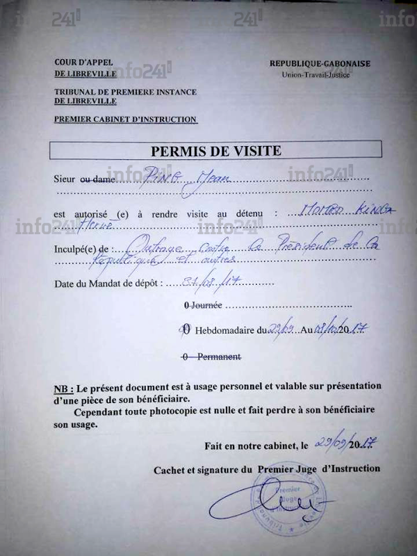 Une des nombreuses autorisations recueillies préalablement par Jean Ping pour rendre visite aux prisonniers politiques