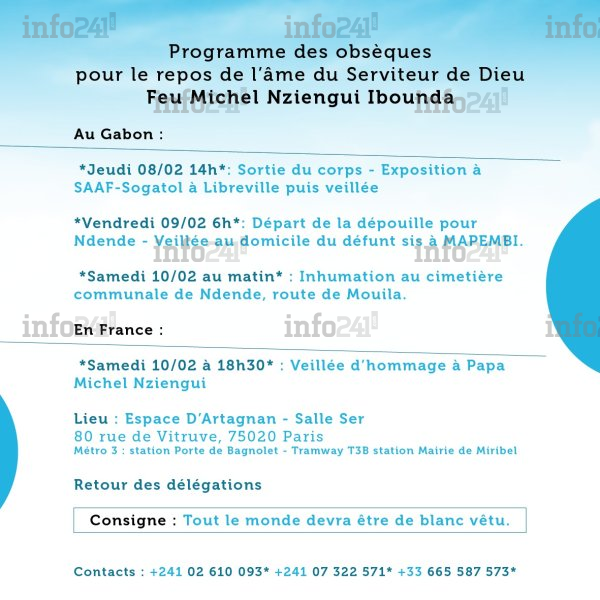 Nziengui Ibounda Michel était le père de notre confrère Rostano Mombo Nziengui, Rédacteur en chef d’Info241 et fondateur project manager du groupe de communication Continental Com Corporate. Cet homme de Foi et du sens du service à la nation patriotique et républicaine, a été fortement engagé dans la promotion des valeurs chrétiennes au Gabon et en Afrique. Le natif de la Dola, médaillé du travail a servi l’Etat gabonais avec exemplarité toute sa vie est décédé le 28 janvier dernier au centre de cancérologie d’Agondjié des suites d’une longue et curieuse maladie dont les médecins gabonais n’ont pas pu diagnostiquer ni catégoriser le stade. Que notre confrère et toute la famille Nziengui trouve dans ces lignes nos condoléances et notre soutien moral et spirituel fraternel.