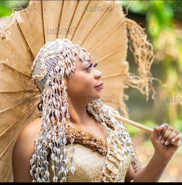La diva, telle une reine africaine dans sa splendeur artistique vêtue de raphia et des cories made in Gabon