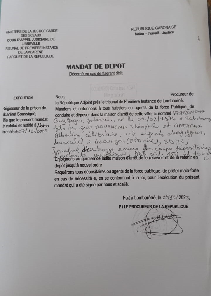 Selon le mandat de dépôt délivré par la procureure adjointe du tribunal de première instance de Lambaréné, ce père de famille aurait commis le crime de lèse-majesté en interpellant le président de la transition sur la persistance du racket opéré par les gendarmes. Il a ainsi été inculpé pour « outrage envers des corps dépositaires d’autorité publique », simplement pour avoir exprimé à voix haute ses interrogations sur le fait de savoir si le racket pratiqué par les forces de l’ordre servait à payer la dette extérieure du Gabon.
