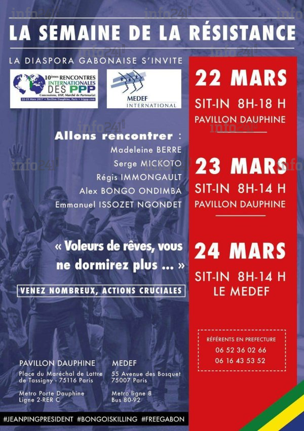 Par ailleurs, à l’occasion des 10èmes ’’Rencontres Internationales des Partenariats Publics Privés’’ (PPP) qui se dérouleront à Paris les 22 et 23 mars 2017, au cours de ce grand rendez-vous annuel dédié aux PPP, réunissant l’ensemble des acteurs publics et privés impliqués dans la mise en œuvre de contrats de partenariat, une manifestation de contestation de la diaspora sera organisée. Car durant ces rencontres expliquent les organisateurs de la semaine de la résistance »des représentants des intérêts du système Bongo-PDG, de la pieuvre holding et Delta Synergie ont été conviés en vue de défendre les opportunités d’investissements en infrastructures au Gabon. Il ne s’agira aucunement des intérêts du Gabon, mais ceux d’une oligarchie d’apparatchiks qui tienne le pays en otage depuis 50 ans. C’est pourquoi Ali Bongo et son régime putschiste refusent le verdict des urnes. "