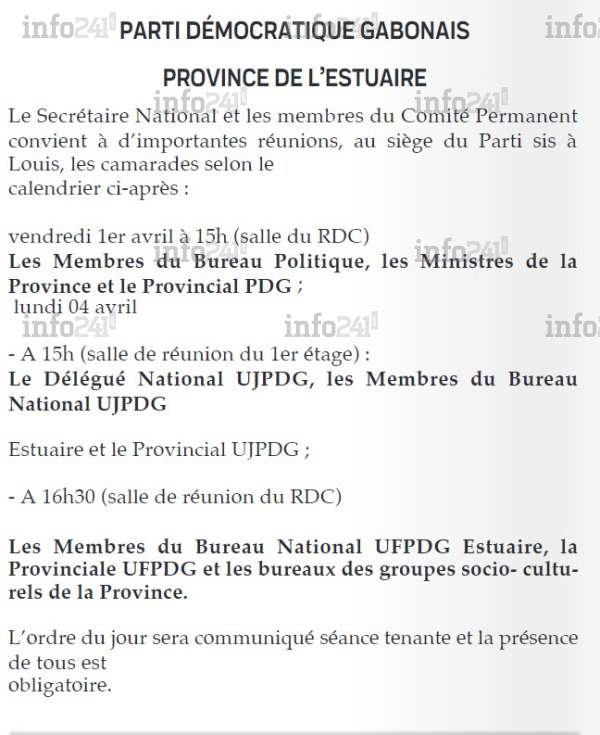 vendredi 1er avril (...) Les Membres du Bureau Politique, les Ministres de la Province et le Provincial PDG ».