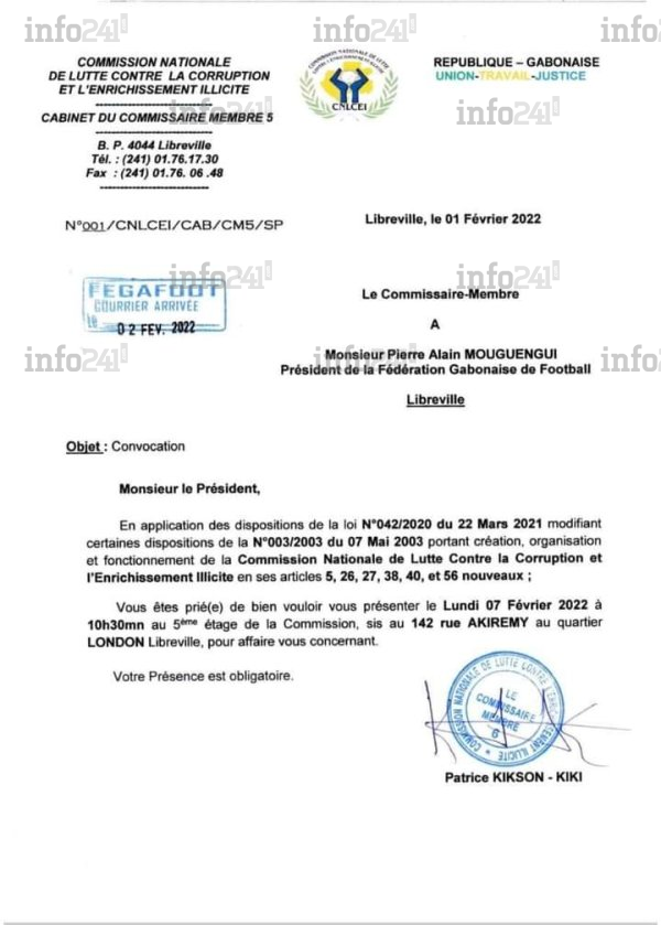 Celui-ci est prié de se présenter ce lundi « 07 Février 2022 à 10h30mn au 5ème étage de la Commission, sis au 142 rue AKIREMY au quartier LONDON Libreville, pour affaire vous concernant », conclu la convocation datée du 1er février et dont la Fegafoot n’a accusé réception que ce mercredi. Affaire à suivre...