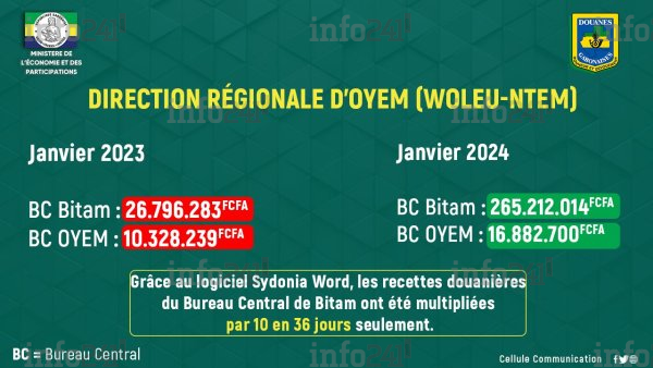 En comparaison avec la capitale provinciale Oyem, où le logiciel n’est pas encore déployé, les recettes douanières de la ville ont enregistré une évolution beaucoup moins significative, passant de 10,32 millions en janvier 2023 à 16,88 millions en janvier 2024. Il est important de rappeler que Sydonia Word offre une traçabilité complète des déclarations de marchandises, centralisée au niveau de la Direction générale des douanes à Libreville.