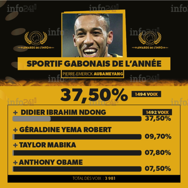 La catégorie sportif gabonais de l’année a connu la victoire d’une courte tête de Pierre-Emerick Aubameyang qui a recueilli 1 494 suffrages soit 37,50% suivi de près par Didier Ibrahim Ndong second avec 37,50% et 1 492 voix soit une différence de deux voix. Géraldine Yema Robert a terminé 3e avec 9,70%, Taylor Mabika (4e avec 7,80%) et Anthony Obame (5e avec 7,50%).