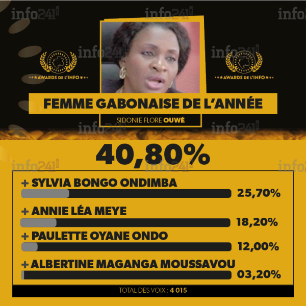 La catégorie femme gabonaise de l’année a vu la victoire de la magistrate Sidonie Flore Ouwé qui a recueilli 1640 voix soit 40,80% devant Sylvia Bongo Ondimba (2e avec 25,70%), Annie Léa Meye (3e avec 18,20%), Paulette Oyane Ondo (4e avec 12%) et Albertine Maganga Moussavou (5e avec 4,20%).