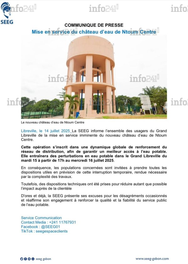 La Société d’énergie et d’eau du Gabon (SEEG) a annoncé ce lundi 14 juillet la mise en service imminente du nouveau château d’eau de Ntoum Centre, dans le cadre d’un vaste programme de renforcement du réseau de distribution du Grand Libreville. Ce nouvel ouvrage stratégique vise à améliorer l’accès à l’eau potable pour des milliers d’usagers de la capitale et de ses environs.