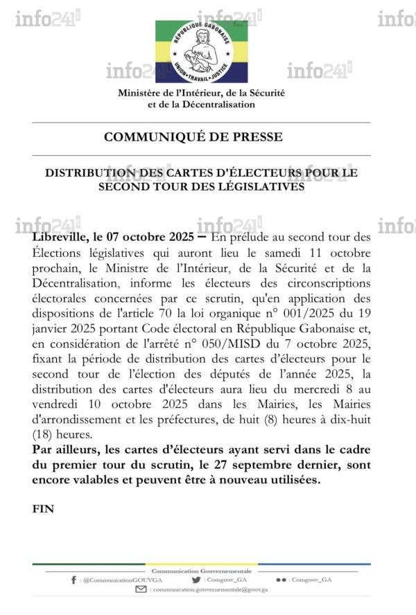 Second tour des législatives au Gabon : les cartes d’électeurs disponibles dès ce mercredi © 2025 D.R./Info241
