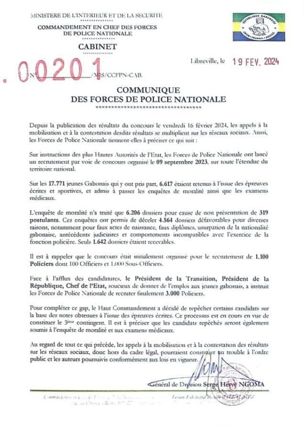 De plus, face à l’engouement, le concours initialement prévu pour recruter 1 100 candidats policiers a été porté à 3 000. Ce qui a permis d’annoncer le 16 février, 2 532 candidats admis, soit 1 328 dans la catégorie sous-officier et 1 204 dans celle des officiers. Parmi les raisons du rejet de certains des 6 206 candidats finaux, le communiqué évoque des faux actes de naissance et diplômes, des usurpations de nationalité gabonaise, des antécédents judiciaires et des « comportements incompatibles avec l’exercice de la fonction policière ».