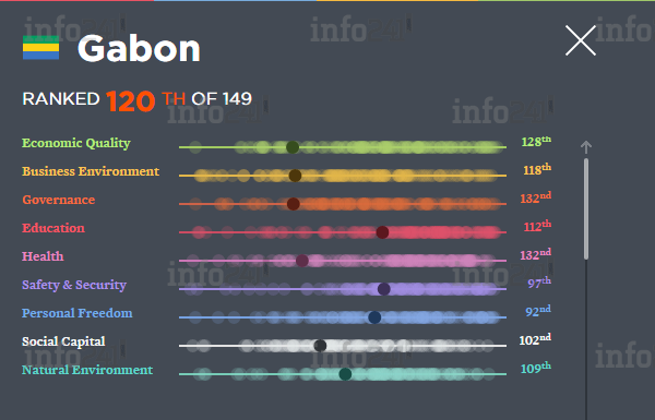 Selon le rapport publié le 3 novembre, « Malgré la paix relative qui semble y régner, le Gabon continue d’être en dessous de 30 sur l’indice de prospérité en raison de faiblesses majeures dans la gouvernance et les sous-indices de santé ». Et d’ajouter une couche sur le climat social et politique : « le Gabon est aujourd’hui confronté à des troubles et autres arrestations auxquels le gouvernement semble incapable de faire face ».