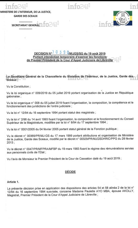 Pour le ministère de la Justice à l’origine de cette décision, la juge «  s’est illustrée par un refus de respecter une décision de justice rendue le 26 juillet 2019 par monsieur le président de la Cour de cassation  ». Une faute qui vaut à l’intéressée une exclusion temporaire de plus de 40 jours des effectifs de la justice gabonaise avec pour conséquence, le non-paiement de son salaire de septembre prochain.