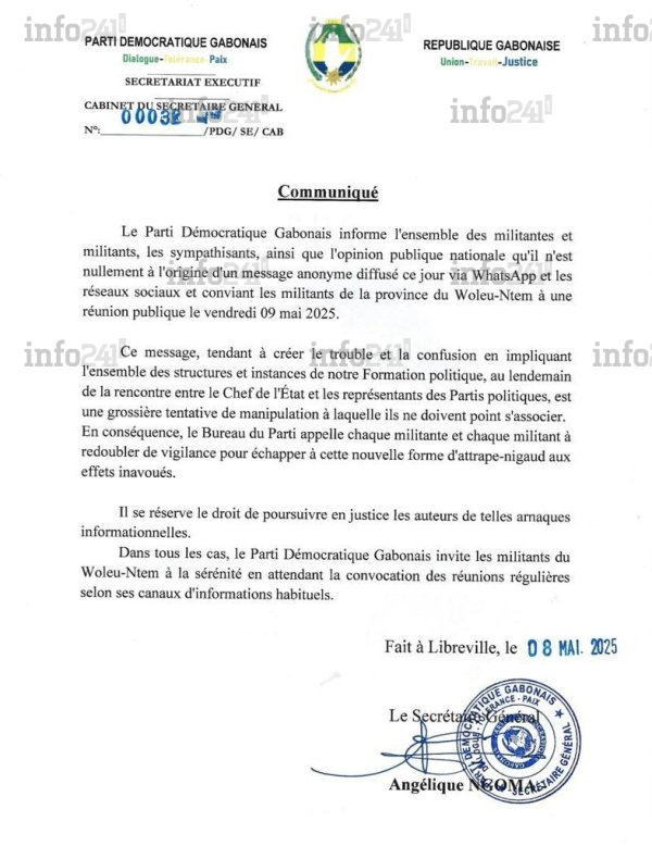 Cette démission collective a commencé en catimini le 7 mai, avec la diffusion d’un communiqué appelant les ressortissants du Woleu-Ntem à une réunion ce vendredi à Libreville. Le document portait les noms de Guy Patrick Obiang Ndong et Charles Mve Ella. Tollé au sein du PDG. Le lendemain, le Secrétariat exécutif du parti publiait un démenti cinglant signé d’Angélique Ngoma, dénonçant une « tentative grossière de manipulation » et menaçant même de poursuites judiciaires contre les auteurs de « cette nouvelle forme d’arnaque informationnelle ».