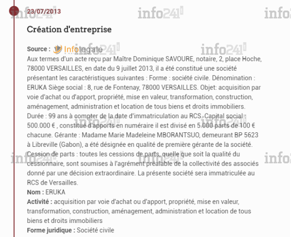C’est ce qu’indique le registre de commerce français. Marie Madeleine Mborantsuo (à Versailles) est à la tête d’une société civile immobilière en région parisienne dénommée Eruka. L’entreprise qu’elle a créé avec sa fille Ruth, la demi-sœur d’Ali Bongo, a pour capital 500.000 euros, soit près de 328 millions de nos francs. La gérante d’Eruka a juste oublié que cette activité professionnelle privée la placerait depuis juillet 2013 en violation de la loi qu’elle est censée observer en tant que juge constitutionnel.