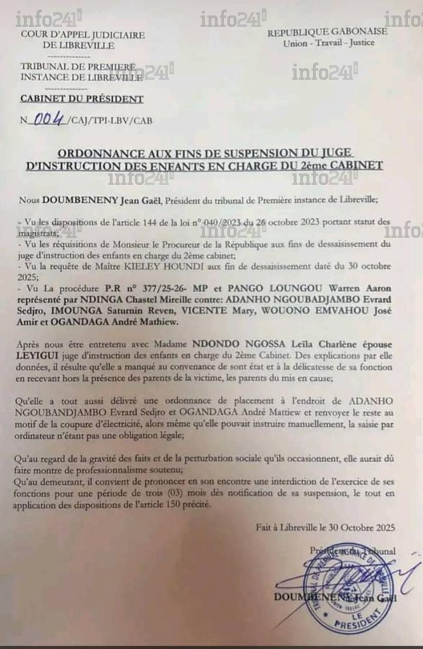 Mais l’affaire a pris un tournant inattendu ce jeudi 30 octobre, avec la suspension de la juge d’instruction en charge du dossier, Leïla Charlène Ndondo Ngossa Leyigui. Selon une ordonnance signée du président du tribunal de première instance de Libreville, Jean Gaël Doumbeneny, la magistrate a été dessaisie du dossier et suspendue pour une durée de trois mois. Elle est acusée dans l’opinion de favoritisme envers les auteurs de faits. Leurs parents étaient soit des hommes d’affaires, des hauts gradés de la police etc.