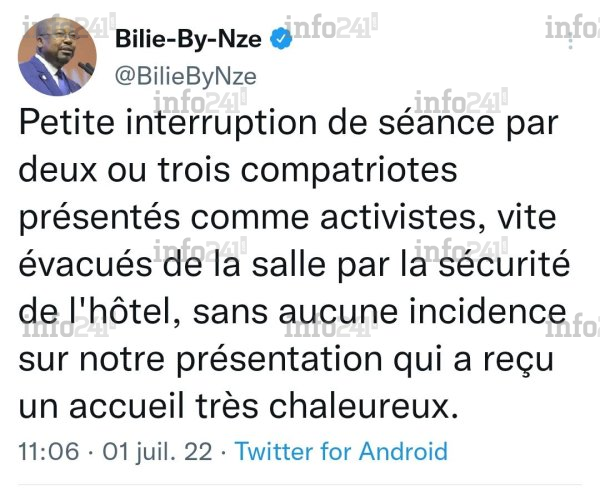 Heureusement pour le ministre gabonais, la sécurité de l’hôtel s’est empressé de jeter hors de la salle ces éléments perturbateurs mais le mal était déjà fait. D’ailleurs quelques minutes seulement après avoir été chahuté, Alain Claude Bilie-By-Nze s’est fendu d’un tweet pour minimiser l’incident avant de finalement le supprimer. L’incident n’a duré moins de 5 minutes mais suffisamment pour faire le bonheur de ces activistes qui ont appelé à la libération des prisonniers politiques détenus depuis la présidentielle d’août 2016 disputée entre Jean Ping et Ali Bongo.