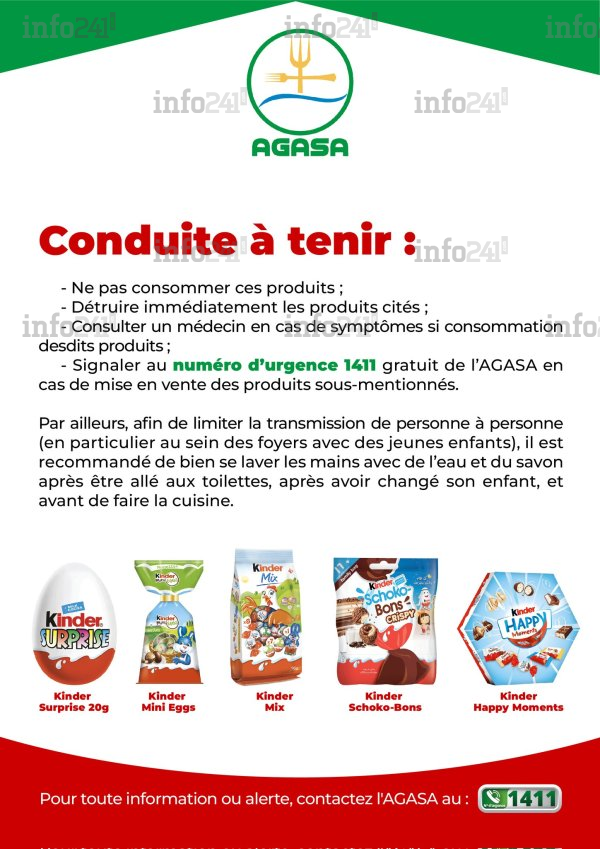« Faisant suite au retrait-rappel de certains produits de la marque Kinder par l’entreprise Ferrero, en raison d’une suspicion de contamination à Salmonella Typhimurium, l’Agence Gabonaise de Sécurité Alimentaire (AGASA) ordonne, en l’absence de numéros de lots clairement identifiés et par principe de précaution, le retrait desdits produits des surfaces de vente », note le communiqué daté du 5 avril.