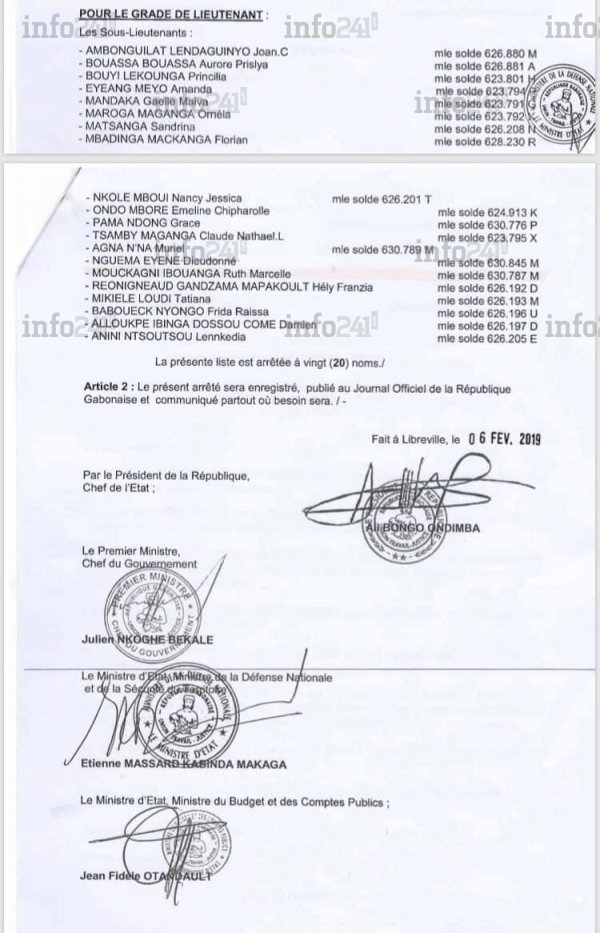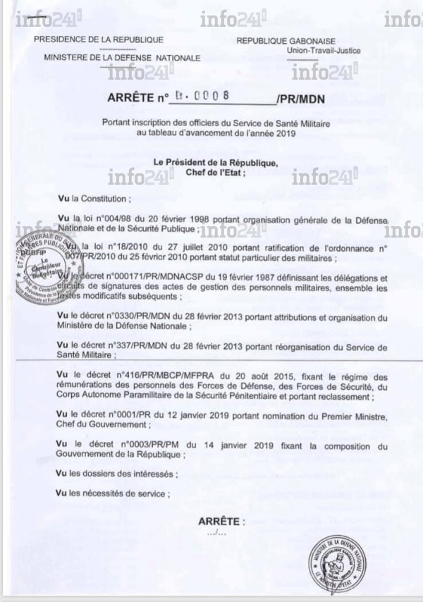 Existe-t-il deux capitales gabonaises dans le monde ? On est en droit de se le demander car Ali Bongo pourtant réputé en exil médical au Maroc depuis son accident vasculaire cérébral le 24 octobre 2018, signe des décrets présidentiels depuis Libreville ! Comme illustration de cette hérésie administrative, un décret qui a fuité, portant « inscription des officiers du service de Santé militaire au tableau d’avancement de l’année 2019 » signé le 6 février !