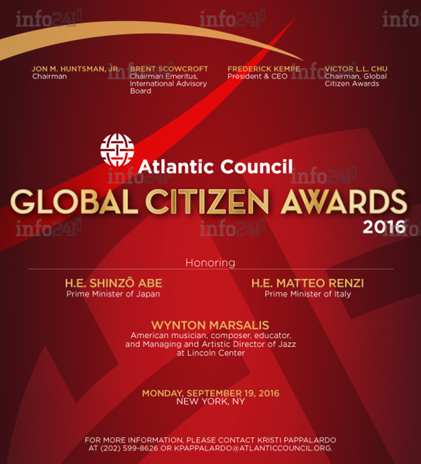 Notons que le Global Citizen Awards sera donc décerné à 3 personnalités internationales ce lundi 19 septembre à New-York au cours d’un dîner de gala : le Premier ministre japonais Shinzô Abe, le Premier ministre italien Matteo Renzi et l’artiste Américain Wynton Marsalis.