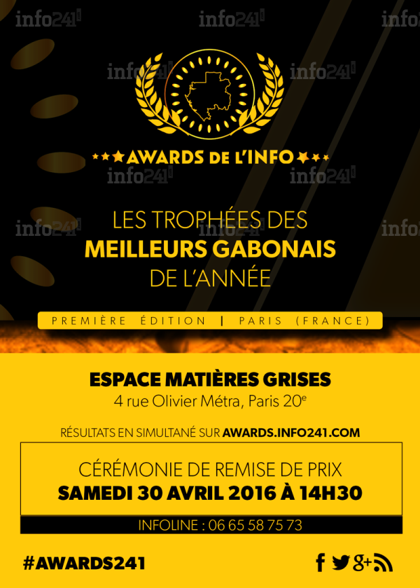 Après l’opération de vote en ligne close le 10 février dernier, la première édition des Awards de l’info™ 2015 qui récompense les meilleurs gabonais de l’année dans 7 catégories, aura lieu ce samedi 30 avril à 14h30 dans le 20e arrondissement de Paris. C’est ce que précise un communiqué du Comité d’organisation.