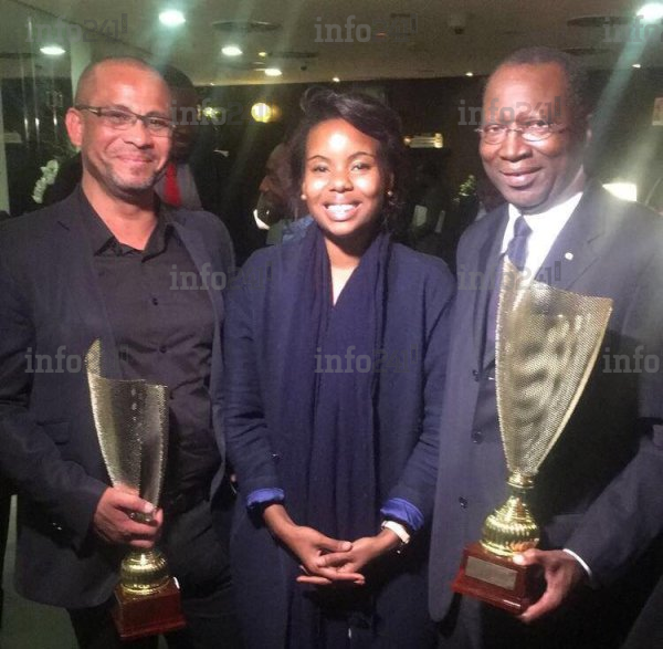 Jean Jacques Bourdette accompagné de Charles M’Ba lors de la cérémonie des remises des prix