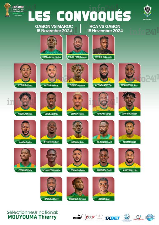 Le sélectionneur national du Gabon, Thierry Mouyouma, a devoilé ce vendredi la liste des 26 joueurs retenus pour les deux derniers matchs des éliminatoires de la Coupe d’Afrique des Nations (CAN) 2025. Ces rencontres cruciales se joueront contre le Maroc le 15 novembre à Franceville et la République centrafricaine (RCA) le 18 novembre en Afrique du Sud. Avec une qualification en jeu, ces confrontations s’annoncent déterminantes pour les Panthères du Gabon, 2e du groupe B de ces éliminatoires qui devront arracher leur ticket pour la CAN en Côte d’Ivoire.