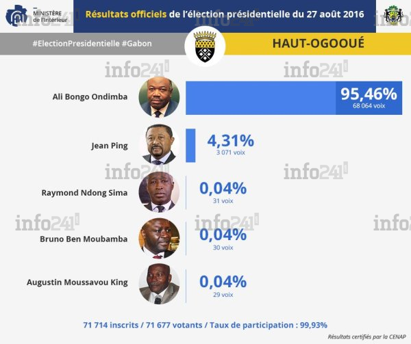 La première chose qui surprend lorsqu’on regarde les chiffres du ministère de l’Intérieur c’est le pourcentage d’Ali Bongo (95, 46%) qui n’est pas conforme aux chiffres annoncés par le ministère car si on procède à un rapide calcul (une basique règle de trois) en considérant toutes les données officielles pour la province du Haut-Ogooué, Ali Bongo obtient plutôt avec ses 68.064 voix pour 71.677 votants, 94,95% de suffrages exprimés. Mauvais calcul ? Précipitation ?