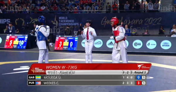 Déjà dès le premier round où les deux combattantes se sont tout d’abord tenues en respect avant de voir Crystal Weekes marquer les tout premiers points du combat dans les 30 dernières secondes. A l’issue du premier round, le score sera finalement de 2 points à 1 pour la Portoricaine. Le second round verra la championne gabonaise revenir dans le jeu en l’emportant, là encore d’une courte tête, par 4 points à 3.