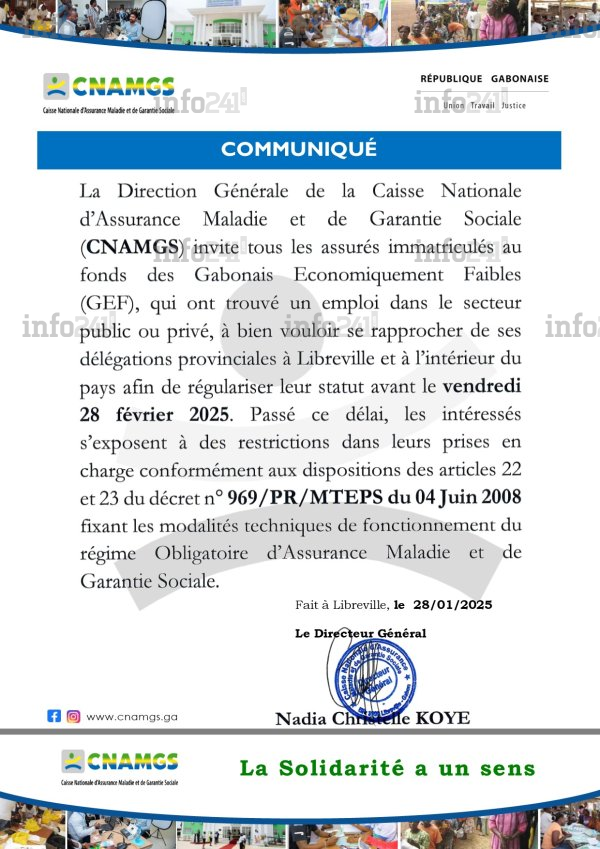 Selon le communiqué signé de la DG Nadia Christelle Koye, « les assurés immatriculés au fonds des Gabonais Économiquement Faibles (GEF), qui ont trouvé un emploi dans le secteur public ou privé, doivent se rapprocher des délégations provinciales à Libreville et à l’intérieur du pays afin de régulariser leur statut ». Passé ce délai, ceux qui ne se seront pas signalés s’exposent à des « restrictions dans leurs prises en charge », en application des articles 22 et 23 du décret n° 969/PR/MTEPS du 04 juin 2008.