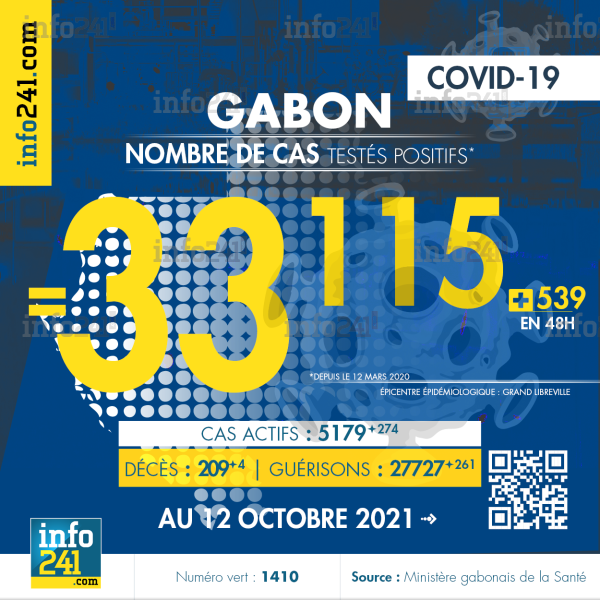 Ce qui porte le bilan à 33 115 cas confirmés, 209 décès et 27 727 guérisons. Le Gabon compte actuellement 5 179 (+274) cas actifs de la pandémie officiellement déclarés. Parmi eux 108 (+18) patients hospitalisés dans le pays dont 26 (+5) en réanimation.