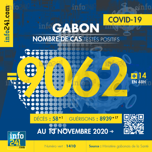 Bilan épidémiologique du Gabon au 13 novembre 2020 : 14 nouveaux cas enregistrés en 48h dans l’Estuaire. Il y a eu un nouveau décès et 17 nouvelles guérisons.