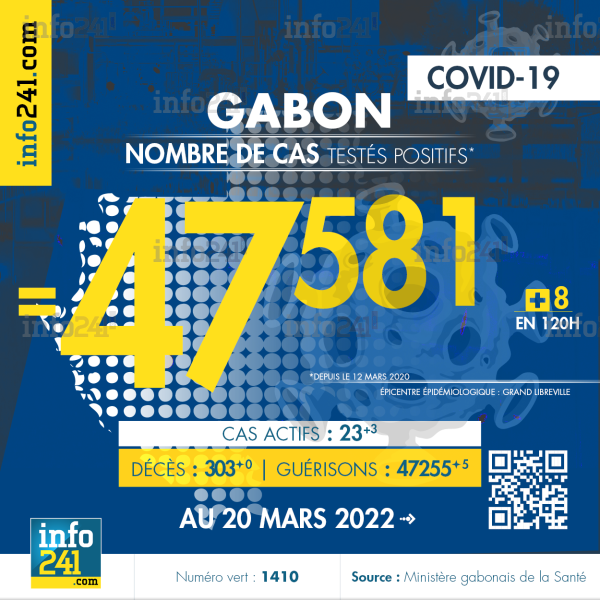 Bilan épidémiologique du Gabon au 20 mars 2022 : 8 nouveaux cas enregistrés en 120h dans l’Estuaire (5 cas) et l’Ogooué-Maritime (3 cas). Il y a eu aucun nouveau décès et 5 nouvelles guérisons.