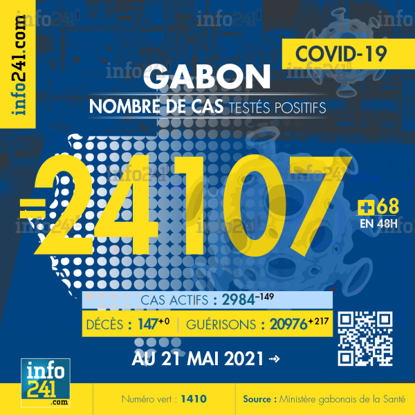Ce qui porte le bilan à 24 107 cas confirmés, 147 décès et 20 976 guérisons. Le Gabon compte actuellement 2 984(-149) cas actifs de la pandémie officiellement déclarés. Parmi eux 47(+3) patients hospitalisés dans le pays dont 23(+3) en réanimation.
