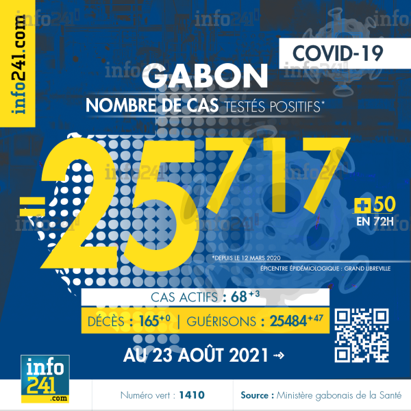 Bilan épidémiologique du Gabon au 23 août 2021 : 50 nouveaux cas enregistrés en 72h dans l’Estuaire (46 cas), l’Ogooué-Maritime (2 cas), le Haut-Ogooué (1 cas) et le Moyen-Ogooué (1 cas). Il y a eu aucun nouveau décès et 47 nouvelles guérisons.