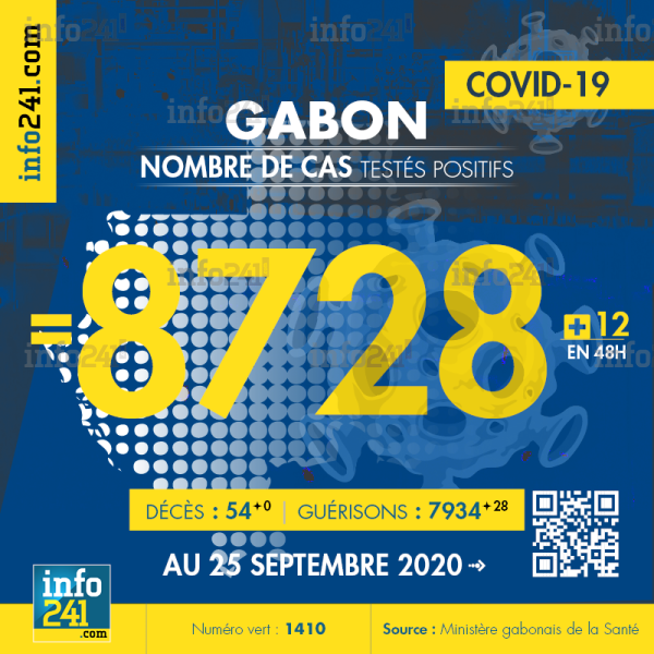 Bilan épidémiologique du Gabon au 25 septembre 2020 : 12 nouveaux cas enregistrés en 48h uniquement dans le Grand Libreville. Il y a eu aucun nouveau décès et 28 nouvelles guérisons.